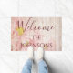 A lovely Welcome Home mat featuring a personalised design, this item displays a pink floral background with beautiful flowers. "Welcome" is portrayed in large cursive burgundy font with your name directly underneath. Place your order today!