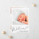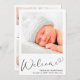 A simple and elegant baby boy ot baby girl birth announcement. The front features your newborn's photo, full name, arrival date and birth stats, and "Welcome" in a stylish script with a heart flourish. On the reverse side of the card, add three more photos and parent and sibling names, and a thank you, visitation or other message.