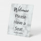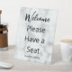 This business sign says Welcome Please Have a Seat. Additional text for your business name is near the bottom. All text is black and can be edited. Welcome is in an elegant script. The sign is faux white marble. (The marble look is artwork.)