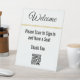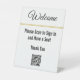 Welcome your visitors with this tabletop welcome sign. This white sign has black display text. Also, the display text can be edited to show your desired text. Display text reads: Welcome Please scan to sign in and have a seat Thank You. Remember to enter your website URL to show the correct QR code.