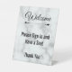 Welcome your visitors with this faux white marble welcome sign. The display text can be edited to show your desired text. (Display text reads: Welcome Please sign in and have a seat Thank You) Welcome is in an elegant cursive script.