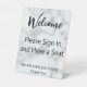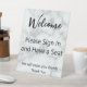 This business sign says Welcome Please Sign In and Have a Seat We will be with you shortly Thank you. All text is black and can be edited. Welcome is in an elegant script. The sign has a faux white marble background.