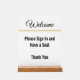 Welcome your visitors with this black white and gold welcome sign. The display text can be edited to show your desired text. Display text reads: Welcome Please sign in and have a seat Thank You