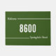 Large white house numbers can be personalised to make a unique housewarming gift. The house numbers are in the centre of a forest green doormat. Above the numbers, you can write your custom message (shown: Welcome). Make it a street address sign by changing the display text under the house number to the recipient's street. All text is white and can be edited or deleted.