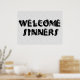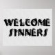 Spider web decorated words say "Welcome Sinners!" so you'll make sure to attract the right kind of crowd whenever you go out to bars, taverns, parties, and other gathering spots for fun and good times.