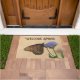 Add a touch of nature to your front door with this welcome doormat. This mat features a bright orange and black monarch butterfly resting on a purple flower. The peach-coloured background compliments the delicate orange wings of this beautiful insect. "Welcome Spring" can easily be customised if you desire.