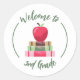 A white round sticker with a stack of books and a red apple on the top to welcome your young students on their first day of school . Personalise the text with your grade level using the provided template . This design is also available in black .