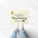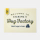 Encourage visitors to your home with this unique typography design featuring the message, "Welcome to Grandma's Hug Factory. Best Hugs in Town." Also features people hugging icon next to the tagline. Design appears in navy, and yellow and light yellow background. Banner in upper left corner includes phrase, "Open 24 hours."