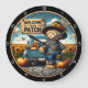 This charming autumn-themed clock features a friendly scarecrow wearing a sunflower hat, sitting on the back of a blue pickup truck filled with pumpkins in a sunflower field. A wooden sign reads "WELCOME TO MY PATCH". The clock has a black border with white numbers 1-12.