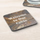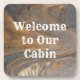 Set your cabin rental apart from your competition with this coaster which welcomes guests in an unexpected and memorable way. This coaster features a beautiful, earthy pattern of swirled brown tone colors. The photo captures the beautiful brown earth tones of woodgrain seen in a highly polished piece of wood. "Welcome to our cabin" can quickly and easily be customized to suit your needs.