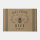 Welcome guests with this cute bee themed doormat featuring a vintage style honeybee illustration adorned with botanical leaves and rope trim detailing. "Welcome to our hive" appears in charcoal lettering. Personalise with your family name along the bottom.