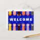 A cute dog and cat cartoon, bold welcome greeting and warm message inside. Easy to personalise for your office.