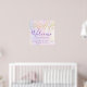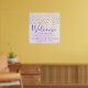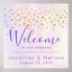 A welcome to our wedding poster. Designed with fake gold confetti sprinkled along the top. A pale purple and yellow watercolor background.