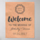 Wedding welcome sign poster in rustic brown kraft paper pattern with vintage wreath illustration and hand lettered style custom text and monogram.