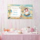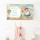 Boy's Baby Shower personalised banner. Sweet soft pastel brown and blue coastal seaside baby shower theme. A little baby boy sleeping inside a while and gold seashell. Pretty blue ocean water with a seahorse, starfish and sand dollar.