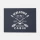 Welcome visitors to your woodsy getaway with this rustic navy blue and white doormat. Design features your personalized cabin logo, with two crossed arrows, a copse of pine trees and a length of twisting rope adorning your family name and year established. Mat reads "Welcome to the [Name] Cabin" in white rustic destroyed typeface.