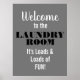 Welcome to the Laundry Room. It's loads and loads of fun! I made this for our laundry room and like it so much that I've decided to share it here. You're looking at an 18" x 24" poster that is ready to frame and hang. The background is medium grey. The bold typography is a combination of black and white. The sentiment is "Welcome to the Laundry Room. It's loads and loads of fun!" What a fun housewarming gift for new home owners.