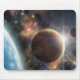 Waiting for clearance in geostationary orbit to leave the home planet and explore new worlds in outer space. Digital artwork by Liz Molnar. Planets, stars, space clouds, lights were made with basic Photoshop effects and brushes, planets' surfaces created from photos.