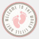 This sticker features two light pink footprints on a white background, surrounded by the text "Welcome to the world little one" in brown text. There is a brown outer circle with white dots, and a customisable darker pink outer circle.