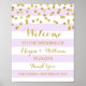 Welcome Wedding Sign Purple Stripes Gold Confetti