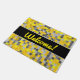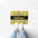 This door mat design features a grid-like tiled squares pattern coloured various shades of yellow and grey. It also features the friendly message "Welcome!" on the front in yellow script-like text.