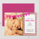 This baby girl birth announcement features light pink, dark pink and chocolate brown diagonal stripes and a pink flagged banner with the word: welcoming. A photo frame and custom text allow you to upload your favourite photo of your new baby and her birth details.