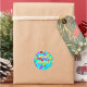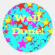 Round award sticker is decorated with colourful stars over a light blue background. This design can be customised. Perfect for school rewards.