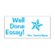 This encouraging rubber stamp design features the positive message "Well Done Essay!" and a customised teacher name. It also features a decorative star shape. It could be used by a school teacher or educator when marking assignments, to acknowledge that the student has done well.