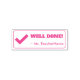 This inspirational rubber stamp design features the encouraging message "WELL DONE!" and a personalised teacher's or educator's name. It also features a decorative checkmark icon. It could be used by a school teacher, educator, instructor, or tutor when marking assignments, to indicate that a student has done well.