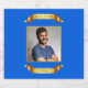 A bright blue coloured photo frame with shiny gold effect scrolls containing the words “Well Done” in gold text.