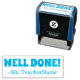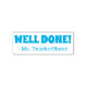 This inspirational rubber stamp design features the positive message "WELL DONE!" and a personalised tutor name. It could be used by a teacher, educator, or tutor when marking assignments, to indicate that the student has done well.