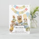 This cute boy's birthday party invitation features "happy birthday" bunting flags, a bear with a party hat, surrounded by toy trains, squirrel, mouse, and a cat with balloons. The reverse side features a light blue background with white polka dots. Personalise for your needs. You can find matching products at my store.