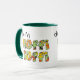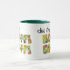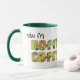 An attractive white ringer mug with a Dark Green Lip and Handle and 'I like coffee' in the Welsh language'. The letters are filled with a pattern of red, orange and yellow nasturtium flowers.