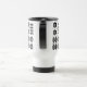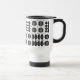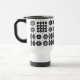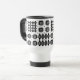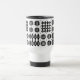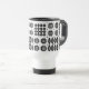 A chic White Non-spill Travel Mug, with a with a pattern of traditional Welsh Tapestry motifs in Black on a White background.This pattern can be adjusted to fit any mug.