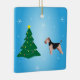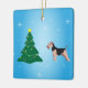 A well-behaved Welsh terrier stands next to a Christmas tree.