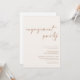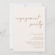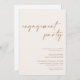 A modern minimal engagement party invitation with modern script font and neutral beige and terracotta tones.