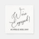 This elegant script font features the text We're Engaged! for a modern and sophisticated look to your engagement party decor.