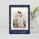 This modern and unique photo engagement party invitation card is perfect to let family and friends know you are engaged and invite them to the party. Send these to your guests with white calligraphy script 'We're Engaged', your photo surrounded by gold glitter hearts on a dark blue background. On the reverse is all your party information. Easy DIY (Do It Yourself) by editing the text in the text boxes on the right side of the screen. Also available in postcard format.
