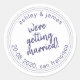 Chic and simple save the date label, with your names and wedding date in navy blue modern typography on a white background, and the text 'we're getting married' in stylish script font. Use these wedding stickers for your wedding gifts, gift bags or as a save the date envelope seal. Exclusively designed for you by Happy Dolphin Studio. If you need any help or matching products, please contact us at happydolphinstudio@outlook.com.