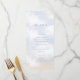 Elegant dusty blue calligraphy and dreamy watercolor clouds "We Are On Cloud Nine" themed menu card.