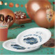These We're Over The Moon Baby Shower Paper Plate are perfect for a simple baby shower. The modern whimsical design showcases a navy-blue watercolor cloud shape adorned with a yellow crescent moon and scattered stars.