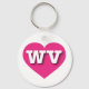 This keychain features a vibrant and shapely hot pink heart containing the bold, white, upper case letters WV, the official abbreviation for West Virginia, the mountain state.