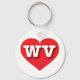 This keychain features a vibrant red heart containing the bold, white, upper case letters WV, the official abbreviation for West Virginia, the mountain state.