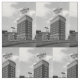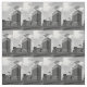 Stylish fabric features a brick repeat of a black and white photograph of a semi-cylindrical tower. The Western Auto sign atop the building is encircled by an arrow. Since the sign is not parallel to the flat side of the brick edifice, it draws attention to the building's curved design.