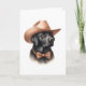 An adorable touch of western charm illustrates this black Labrador dressed as a cowboy. Featuring a detailed watercolor-style portrait, this design shows a loyal black Lab wearing a tan cowboy hat and matching bow tie. This blank greeting card is perfect for dog lovers, ranch fans, or anyone who appreciates a rustic country vibe. Ideal for birthdays, anniversaries, get well, or any occasion.