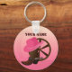 A graphic illustration of a western wagon wheel, cowgirl hat and cowgirl boots on a custom premium keychain. The keychain has a text template for your personalisation. Original artwork: Copyright Charmaine Paulson