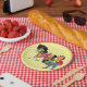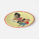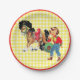 Western themed party plates with a little cowgirl and a horse. The background is yellow check with a red border.