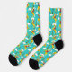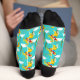 Add some fun to your feet with these patterned socks. The camp retro style pattern features illustrations of a western cowgirl and horse in bright yellow, red and blue against a bright aqua blue background.