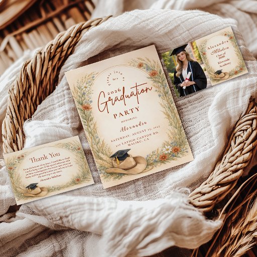 Celebrate your graduate with a warm western-inspired design featuring classic cowgirl boots, a graduation cap detail, and delicate wildflowers woven through soft prairie grasses. The earthy neutral palette of beige, sage, dusty blue, and warm terracotta creates a refined ranch aesthetic that feels both modern and timeless. Ideal for country-loving grads, rodeo girls, or anyone who feels at home under open skies. A balanced blend of rustic charm and elegant botanical detail for a memorable celebration.