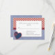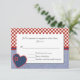 Fun western theme wedding response RSVP card done in red, white, and blue graphics. The top of the card is done in a red and white checked pattern, with a blue denim look, on the bottom half and covering the back of the card. Graphics of a blue and red denim applique heart decorates the bottom left corner. All text is customisable and ready to personalise for your western theme wedding. Matching wedding products available.